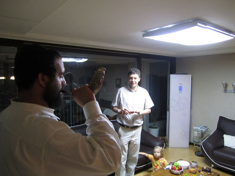 Berry Spitetski (left) and Moshe Frank (right) searching the Jews on the Korean map with Rabbi Osher Litzman